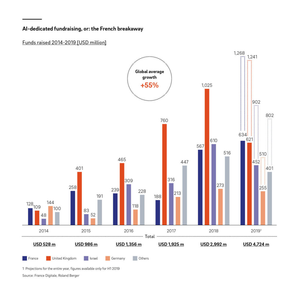 Auf Frankreich, Großbritannien, Israel und Deutschland entfielen in den Jahren 2009 bis 2019 gut 80 Prozent der Investitionen. Unter den fünf größten ausländischen Geldgebern sind amerikanische Investoren in den jeweiligen Ländern stark vertreten: Sie stellten im vergangenen Jahr 17,5 Prozent der ausländischen Geldgeber in Großbritannien, 14 Prozent in Deutschland und 7,5 Prozent in Frankreich dar. Chinesische Investoren spielen hingegen bisher kaum eine Rolle. Die europäischen KI-Ökosysteme hängen immer noch stark von ihren inländischen Investoren ab. „Allerdings hat die Finanzierung von KI-Startups erst seit 2014 richtig Fahrt aufgenommen“, so Ashok Kaul, Partner von Roland Berger. „Seitdem liegen die jährlichen Wachstumsraten bei über 50 Prozent.“ In Zahlen: 2014 wurden in allen untersuchten Ländern insgesamt nur 528Mio.$ in KI-Startups investiert – nur etwas mehr als 2019 allein in Deutschland.