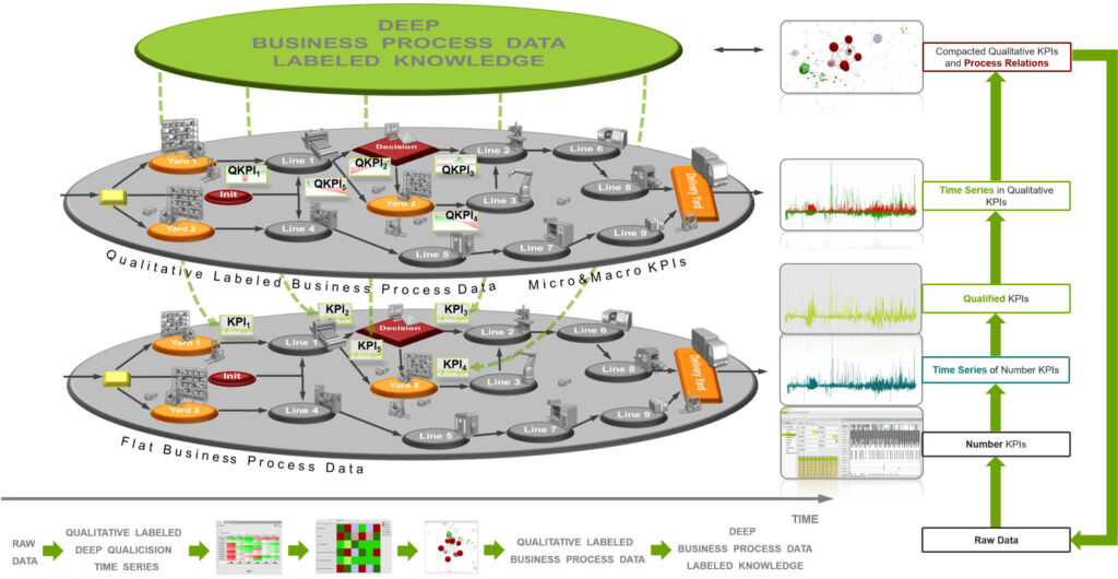 Ein solches maschinelles Lernverfahren ist das Qualitative Labeln, das Bestandteil des Frameworks der Deep Qualicision KI ist. Dieses Lernverfahren kann auf der Behandlung von Key Performance Indicators (KPIs) beruhende Software um selbstlernende Labeling-Fähigkeiten erweitern. Zwischen den nicht aufbereiteten, rohen Geschäftsprozessdaten und Methoden der künstlichen Intelligenz schlägt das Verfahren auf diese Weise automatisiert eine algorithmische Brücke. Die Auswertung von Datenströmen bereitet rohe Geschäftsprozessdaten für Prozessverantwortliche in verständlicher Form auf. Daten aus diesen Prozessen werden mit KPIs qualitativ bewertet und Zusammenhänge daraus erlernt. So werden Geschäftsprozessdaten laufend qualitativ gelabelt und für den Einsatz weiterer KI-Methoden aufbereitet.