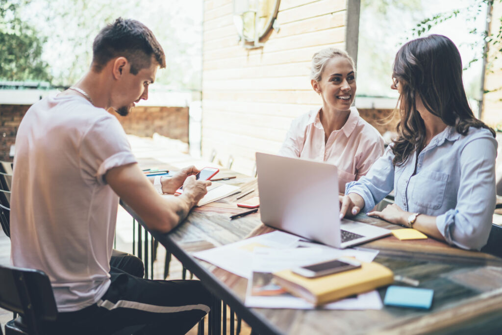 Cheerful women interacting with each other about new project while concentrated man texting at smartphone at big table in open air cafe