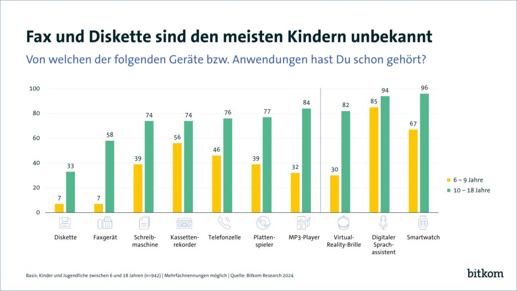 Diskette, Schreibmaschine und Fax – früher Alltag im Büro und den eigenen vier Wänden – heute für viele Kinder und Jugendliche ein Rätsel. Insgesamt knapp drei Viertel (73 Prozent) der Kinder und Jugendlichen zwischen 6 und 18 Jahren haben noch nie von einer Diskette gehört, über die Hälfte (56 Prozent) wissen nicht, was ein Faxgerät ist. Unter den 6- bis 9-jährigen Kinder haben dabei sogar nur sieben Prozent schon einmal von einer Diskette gehört. Auch unter den etwas Älteren zwischen 10 und 18 Jahren kennt nur noch ein Drittel (33 Prozent) dieses Speichermedium. Mit dem Faxgerät können nur sieben Prozent der 6- bis 9-Jährigen heutzutage etwas anfangen, unter den 10- bis 18-Jährigen kennt es aber immerhin mehr als die Hälfte (58 Prozent). Das sind Ergebnisse einer repräsentativen Studie im Auftrag des Digitalverbands Bitkom, für die mehr als 900 Kinder und Jugendliche zwischen 6 und 18 Jahren in Deutschland befragt wurden. Von der Schreibmaschine haben 39 Prozent der 6- bis 9- Jährigen schon gehört, unter Kindern ab 10 Jahren 74 Prozent. „Je jünger die Kinder, desto weniger bekannt sind die Geräte, die früher mal als Meilensteine der Technik galten. Viele kennen diese nur aus Erzählungen oder Museen“, so Dr. Sebastian Klöß, Experte für Consumer Technology beim Bitkom. Weniger als die Hälfte der 6- bis 9-Jährigen (46 Prozent) kennt noch Telefonzellen.