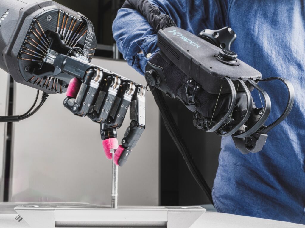 Im Zukunftslabor erfolgt die Kommunikation mit dem Roboter per Daten. Edgar Welte generiert diese durch seine Bewegungen mit dem HaptX-Glove und erklärt dem sechsachsigen Cobot damit, wie er sich drehen und Werkzeuge oder Werkstücke packen muss. Durch die 20 Stellmotoren kann die Shadow-Dextorous-Hand die menschliche Greifbewegungen fast exakt nachbilden. Die Drucksensoren in den mechanischen Fingern geben dem Operator direktes Feedback. Welte spürt durch kleine Luftpolster im Handschuh, sobald das Gewicht zunimmt oder das Werkzeug falsch in der Hand liegt. Fasst er nach, tut es ihm der Greifer gleich – in Echtzeit. Wie die Forschenden mitteilen, wird dies eine wichtige Funktion sein, wenn die Maschine später per KI selbstständig lernt.