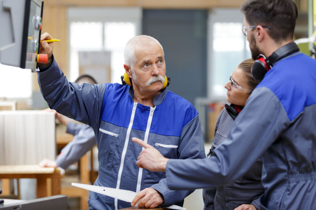 carpenter trainees learning with boss about wood measurement