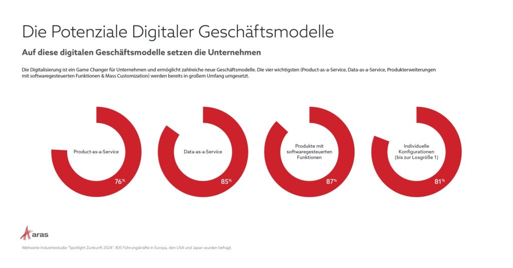Wie wichtig Geschäftsmodelle wie Product-as-a-Service (PaaS) und Data-as-a-Service (DaaS) bereits sind, zeigen die Ergebnisse der Aras-Studie: 76 Prozent der Unternehmen weltweit bieten bereits PaaS an oder planen dies. DaaS hat mit 85 Prozent einen noch höheren Verbreitungsgrad erreicht.