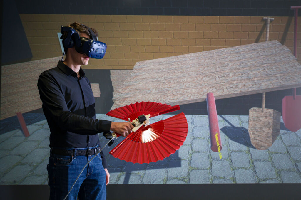 ‚Shifty‘ ist ein stabförmiger Controller, in dem ein bewegliches Gewicht verbaut ist. Dieses kann durch einen Motor entlang der Längsachse verschoben werden, sodass sich der Schwerpunkt und die Trägheit des Stabes ändert. Der Controller könne so die Illusion erwecken, dass ein virtuelles Objekt länger oder schwerer wird, erklärt Zenner. Der Controller ‚Drag:on‘ besteht aus zwei Flamenco-Fächern, die mithilfe von Servomotoren aufgefaltet werden können und so den Luftwiderstand des Controllers erhöhen. Je weiter die Fächer aufgefaltet sind, desto mehr Kraft muss der Nutzer aufbringen, um den Controller durch die Luft zu bewegen.