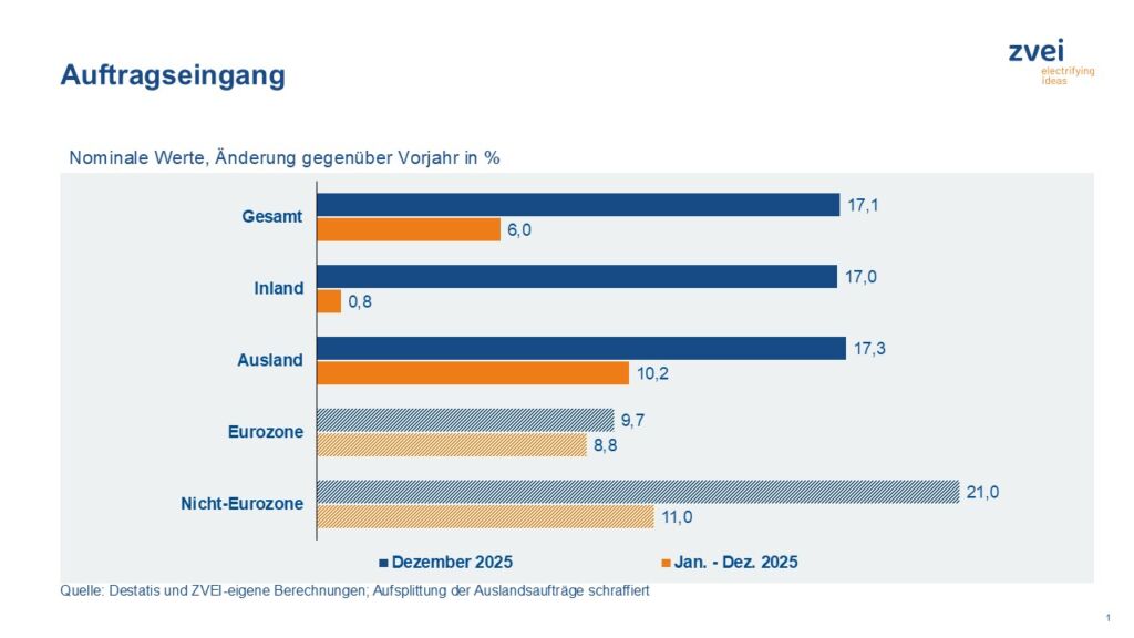 Die deutsche Elektro- und Digitalindustrie hat im Dezember 2025 ein Bestellplus von 17,1% gegenüber Vorjahr verzeichnet. „Es war schlussendlich der Monat mit dem stärksten Auftragsschub im vergangenen Jahr“, sagte ZVEI-Chefvolkswirt Dr. Andreas Gontermann. „Dabei kamen die Impulse gleichermaßen aus dem Inland wie dem Ausland.“ So bestellten inländische Kunden 17% und ausländische 17,3% mehr. Kunden aus der Eurozone erhöhten ihre Bestellungen im Dezember um 9,7%. Aus Drittländern gingen 21% mehr Orders ein. Damit ergibt sich für das Gesamtjahr 2025 ein Bestellzuwachs von 6%. Hier gingen die Entwicklungen der Inlands- und Auslandsaufträge allerdings noch stärker auseinander: Erstere legten nur leicht um 0,8% zu, letztere deutlich kräftiger um 10,2%. Die Auftragseingänge aus dem Euroraum lagen 2025 um 8,8% höher als 2024. Bei den Bestellungen aus Ländern außerhalb des gemeinsamen Währungsraums belief sich der Zuwachs auf 11%. Die reale Produktion der deutschen Elektro- und Digitalindustrie wuchs im Dezember 2025 um 1,5% gegenüber Vorjahr. Im vergangenen Jahr war sie insgesamt leicht rückläufig (-0,4%, vorbehaltlich späterer Revisionen). Für das laufende Jahr erwartet der ZVEI einen Produktionsanstieg um 2%. www.zvei.de