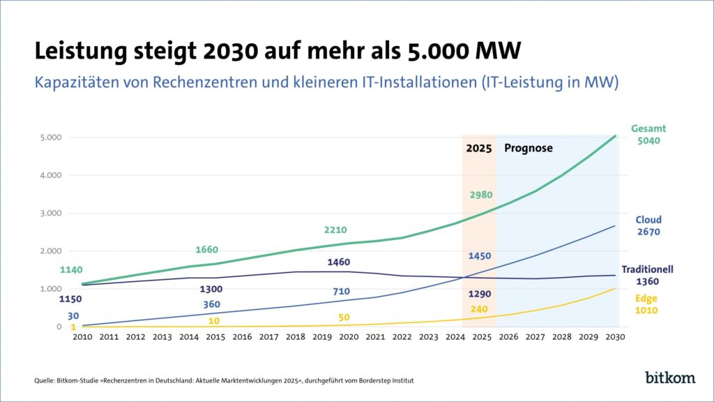 Aktuell machen Rechenzentren für KI rund 15% der gesamten, in Deutschland installierten Kapazitäten aus. Der Branchenverband Bitkom geht davon aus, dass sich die KI-Kapazitäten – die in W gemessen werden – vervierfachen werden, von derzeit 530MW auf dann 2.020MW Anschlussleistung. Der Anteil von KI-Rechenzentren an den deutschen Gesamtkapazitäten wird dann bei 40% liegen. Insgesamt sind in Deutschland derzeit 2.000 Rechenzentren mit einer Anschlussleistung von jeweils mehr als 100W installiert, darunter 100 größere Rechenzentren mit mehr als 5MW Leistung. Die Leistung aller deutschen Rechenzentren ist 2025 um 9% auf 2.980MW gewachsen, die hundert größten Rechenzentren steuern dazu die Hälfte bei. Anfang 2026 soll erstmals die Marke von 3.000MW und 2030 von 5.000MW überschritten werden. Verglichen mit 2024 werden sich Deutschlands Rechenzentrumskapazitäten dann nahezu verdoppelt haben.