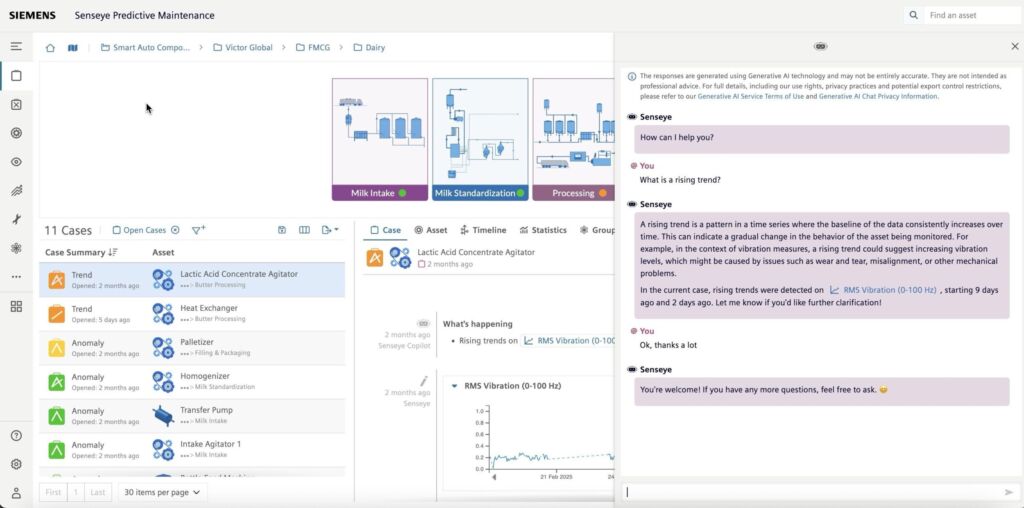Siemens hat Sachsenmilch Leppersdorf mit Produkten zur vorausschauenden Instandhaltung beliefert. Die KI-gestützte Software Senseye Predictive Maintenance hilft dem milchverarbeitenden Betrieb dabei, seinen Betrieb an 365 Tagen im Jahr unter strengen Qualitätsstandards aufrecht zu erhalten. Sachsenmilch stellt in komplexen und teilweise voll automatisierten Anlagen Produkte wie Milch, Butter, Joghurt, Käse oder Molkederivate für Babynahrung bis hin zu Bioethanol her. Täglich werden 4,7Mio. Liter Frischmilch zur Verarbeitung angeliefert, das entspricht 170 LKW-Ladungen. Daher ist es essenziell, dass die Technik 24/7 funktioniert und die Produktionsanlagen annähernd zu 100 Prozent verfügbar sind.