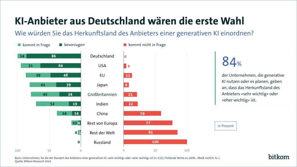 Deutschlands Unternehmen wünschen sich mehr generative Künstliche Intelligenz ‚made in Germany‘. Für 84 Prozent der Unternehmen, die generative KI einsetzen oder dies planen, ist das Herkunftsland des Anbieters wichtig – und eine klare Mehrheit von 86 Prozent würde dabei Deutschland bevorzugen. Auf den Plätzen zwei und drei liegen die USA mit 64 Prozent sowie die EU mit 48 Prozent. Dahinter folgen Japan (39 Prozent), Großbritannien (34 Prozent), Indien (19 Prozent) sowie China (14 Prozent). Das ist ein Ergebnis der Studie ‚KI-Nutzung in Deutschland: Perspektiven aus Bevölkerung und Unternehmen‘. Für die Studie hat der Digitalverband Bitkom in einer repräsentativen Umfrage 602 Unternehmen ab 20 Beschäftigten sowie mehr als 1.000 Personen ab 16 Jahren in Deutschland befragen lassen. Sie wurde heute anlässlich des Digital-Gipfels der Bundesregierung veröffentlicht. Demnach nutzen neun Prozent der Unternehmen bereits generative KI, weitere 18 Prozent planen dies. „Es gibt riesige Chancen für KI-Anbieter aus Deutschland. Um dieser Nachfrage gerecht zu werden, müssen wir bei der anstehenden Umsetzung des AI Acts mit Augenmaß vorgehen und den Unternehmen ausreichend Handlungsspielraum lassen“, sagt Bitkom-Präsident Dr. Ralf Wintergerst. „Deutschland kann und muss zu einem führenden KI-Standort werden.“