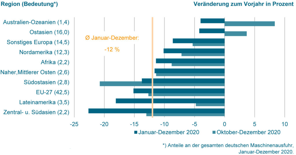 Ein Blick auf die Quartalszahlen für das Jahr 2020 bestätigt das zu erwartende Bild des zeitlichen Ablaufs: Die Maschinenexporte verzeichneten im ersten Quartal noch einen vergleichsweise moderaten Rückgang von 5,1 Prozent im Vorjahresvergleich. Im zweiten Quartal wurden dann 22Prozent weniger Maschinen- und Anlagen ausgeführt, bevor eine schrittweise Besserung einsetzte: Im dritten und vierten Quartal wurden geringere Rückgänge von 12,4 Prozent, bzw. 8,2 Prozent verbucht.